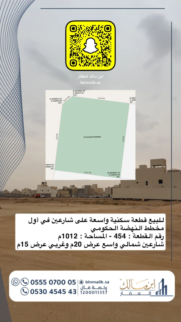 For sale: A spacious residential plot on two streets in the first phase of the Al-Nahda government development. Plot number: 454 - Area: 1012 sq m. Two streets: a wide northern street (20 m wide) and a western street (15 m wide). Ibn Malik Real Estate